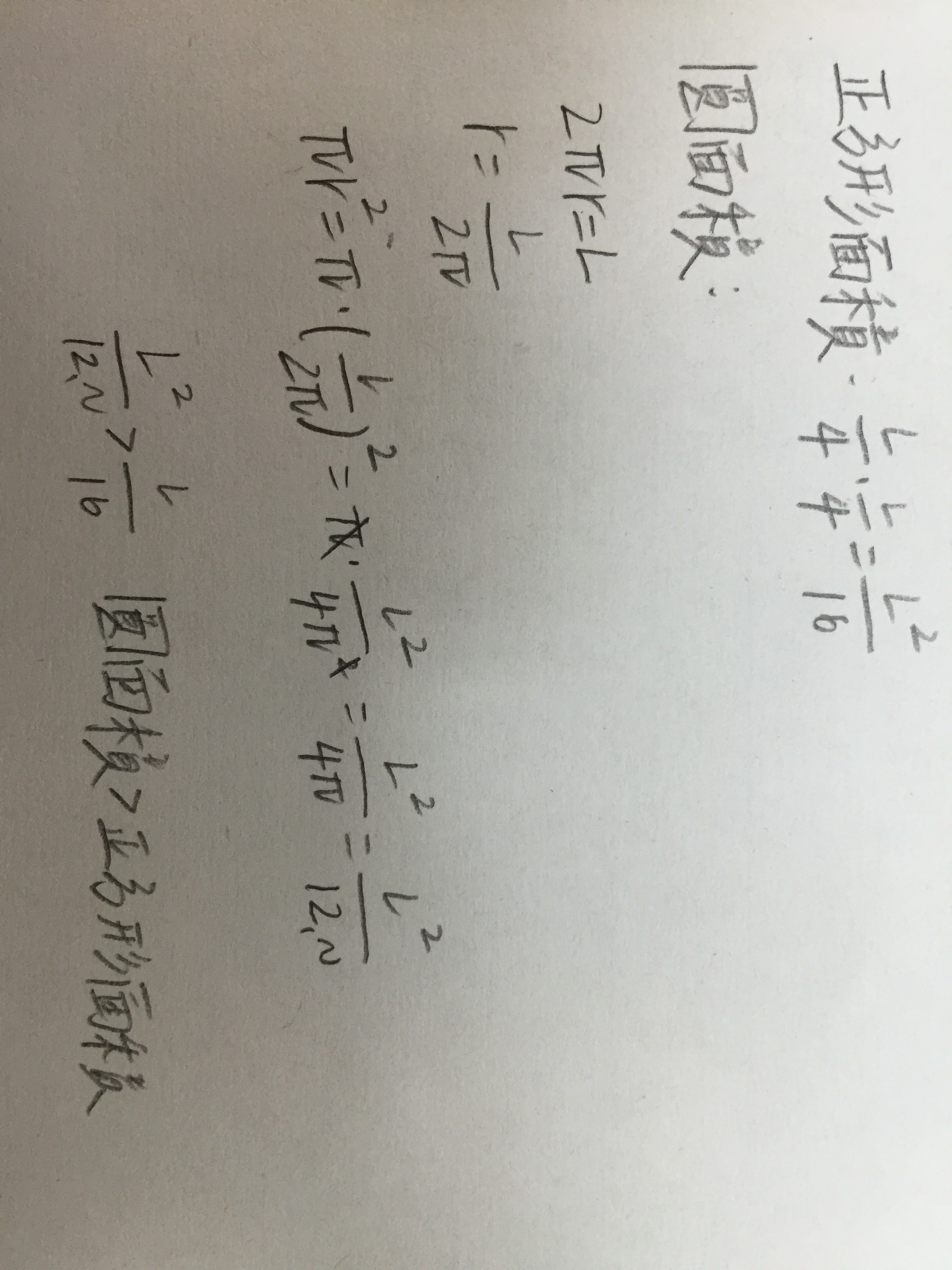 正方形面積 L/4 *L/4=L平方/16 圓形面積 (L/2π)(L/2π)*π=L平方/4π 分子相同,比較分母,分母越大則越小 16〉4π