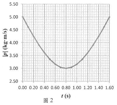 四、某甲用力往地面丢擲質量M之橡膠球,當橡膠球反彈的瞬間為時間零點 (即t=0.00s) 該橡膠球反彈後之動量量值(IPI)與時間t關係如圈2所示, 求反彈後該橡膠球遠到最高點時所需時間等於 (6) s。該橡膠球質量M=_(7) kg(設重力加速度量值為9.80m/s2)。