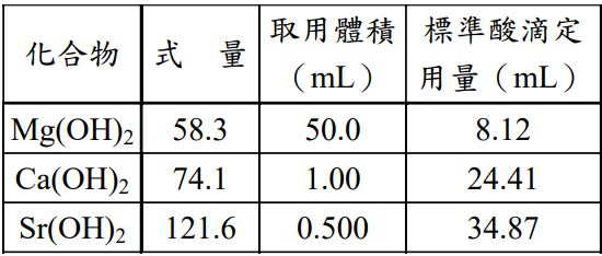 9.某生量測三個鹼土族金屬的氫氧化合物之溶解度,方法如下: