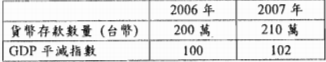 4.下表分別為2006年至2007年間,某甲於第一商银所擁有之貨幣存款數 量與以2006年為基期之本國GDP平減指數,請依下表回答下列問題。(請 ,務必寫出計算過程,否則不予計分。)