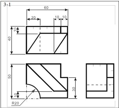 (3-1)請將下圖之三視圖繪製出其「等角立體圖」。依尺寸比例繪製等角立體圖+標尺寸 (每格10mm)