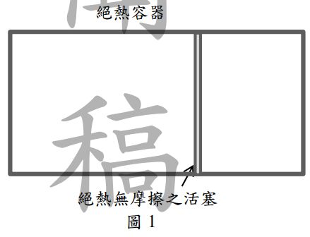 b. 若在不對氣體作功的情況下,將隔板打開使兩室相通,則容器中的氣體最後達到熱平衡時之絕對溫度為__ (2)__ 。