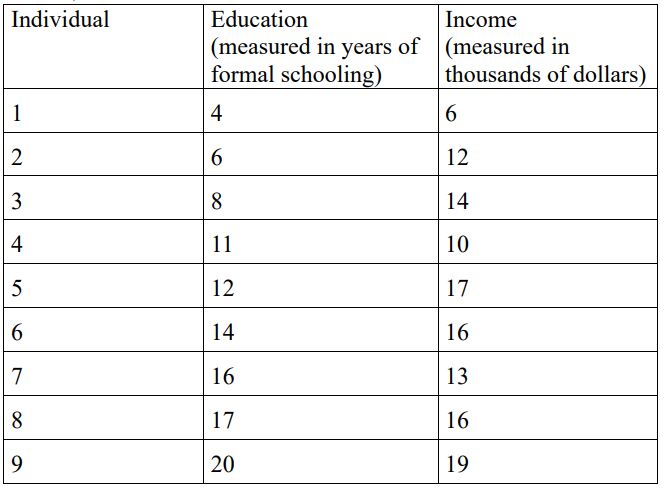 四、A sociologist is interested in the relationship between education and income. Data are collected from nine individuals as follows: